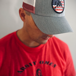 Top off your look with the 'Timber Oaks American Patch Logo Hat' mesh snapback hat. This hat features a bold American flag patch and is designed to show off your patriotism with pride.